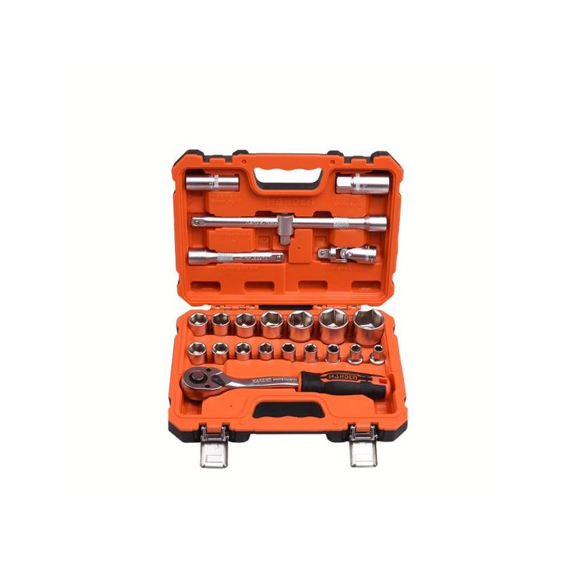Dugókulcs készlet, kiváló minőségű króm anyagból. Erős műanyag tárolójának köszönhetően praktikusan tárolható és könnyen szállítható. A szerszámok ergonomikus kialakításúak, tartós és nagy teljesítményű igénybevételre tervezve.