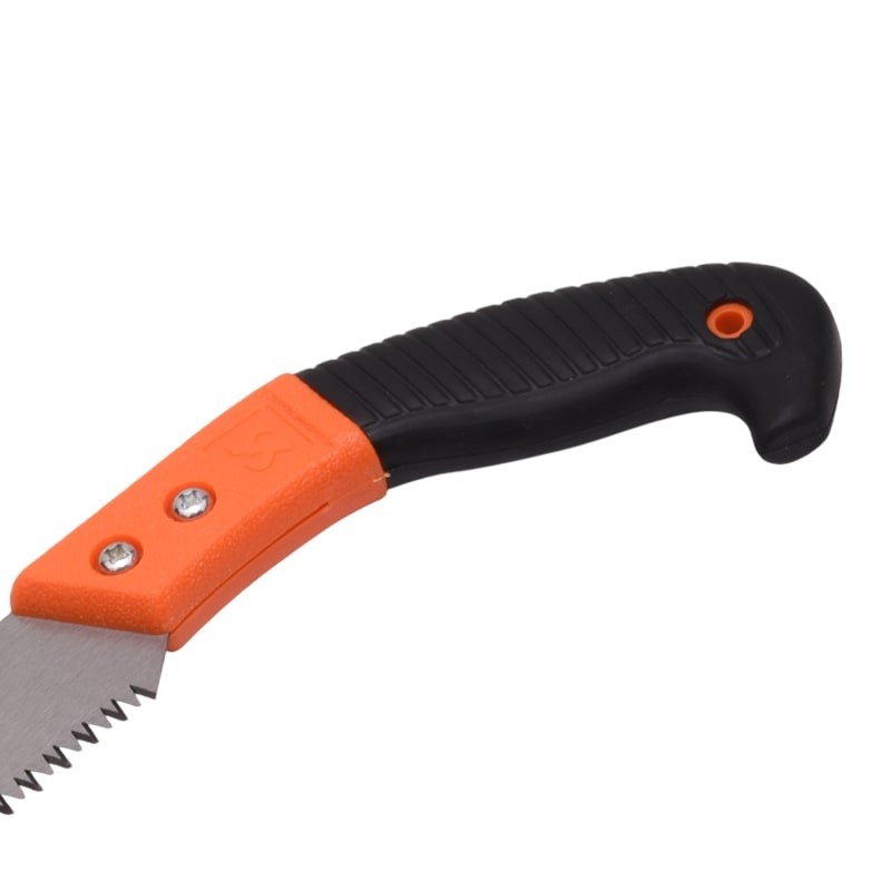 Három élűre élezett fogazatú ágvágó fűrész, ívelt penge a hatékony vágáshoz. A görbített, texturált markolat és a csúszásmentes fogás biztonságos tartást garantál. A görbített penge növeli a vágási teljesítményt, és mind a húzó-, mind a toló mozdulatnál vág, így gyorsabb munkát tesz lehetővé kevesebb erőkifejtéssel. A fűrész tartós műanyag tokot is tartalmaz, amely védi a felhasználót és a pengét tárolás közben.