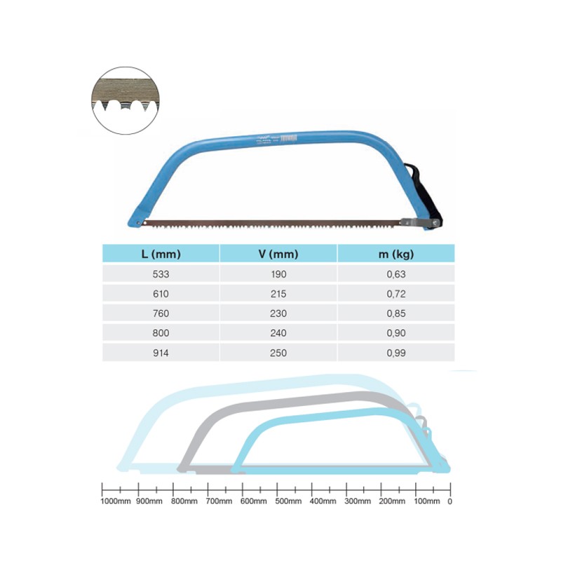 Univerzális keretes fűrész száraz és nyers fa vágására. Cserélhető gyaluló fogazású fűrészlap hosszú élettartamot biztosító fogcsúcsokkal. Edzett, hosszú élettartamot biztosító fogcsúcsok. Ellipszis profilú acélkeret gyorsfeszítővel. Gyors és egyszerű fűrészlap csere.