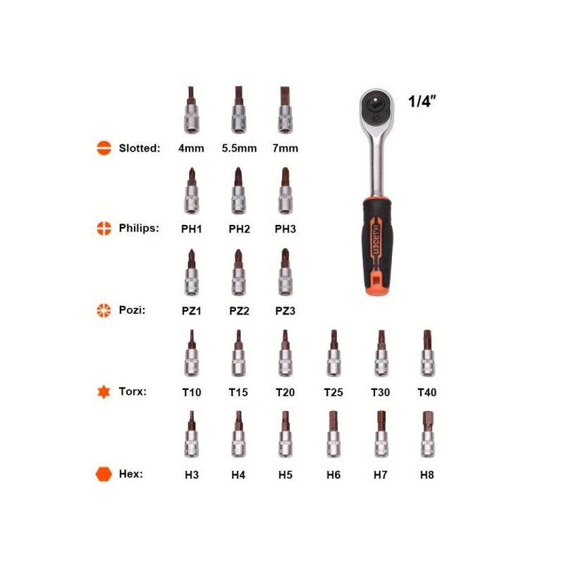 - Dugókulcsok 1/4" (hatszögű): 4-5-6-7-8-9-10-11-12-13 mm