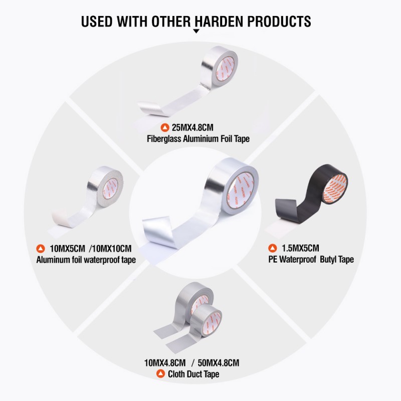 A HARDEN alumínium fólia ragasztószalag széles körben alkalmazható az iparban, az építőiparban és a háztartásokban egyaránt. Ennek oka az alumínium fólia hordozóréteg, amely vízálló, időjárásálló és hővisszaverő tulajdonságokkal rendelkezik, valamint az akril ragasztó, amely erős tapadást, oldószerállóságot és hosszú távú öregedésállóságot biztosít.