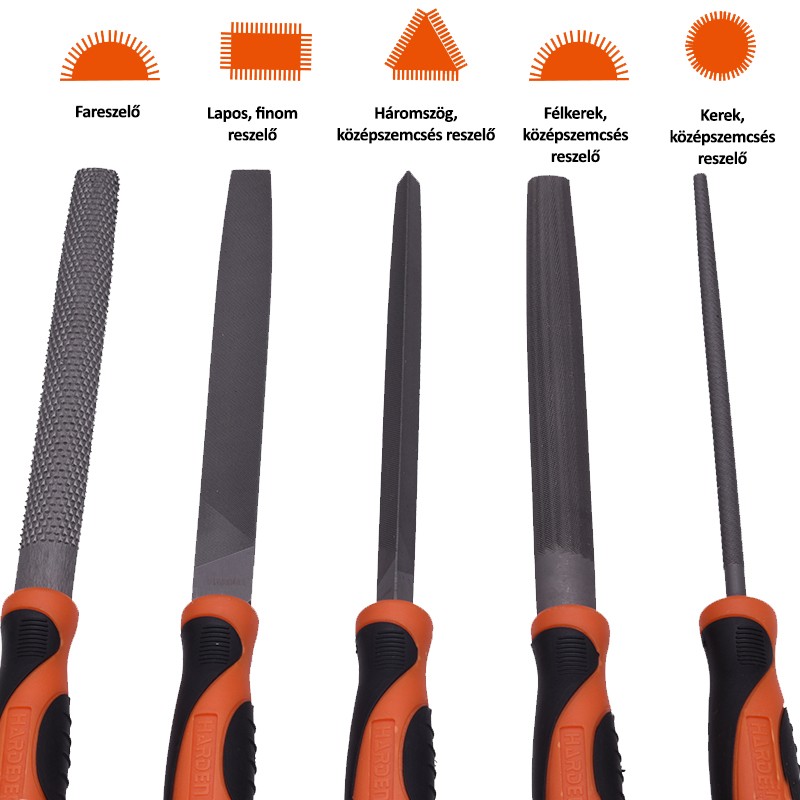 Fa, farost lemez, műanyag és más puha anyag reszelésére szolgál. Az ergonomikus, puha nyél biztosítja a kényelmet és a biztonságot a munkavégzés során. A többfunkciós reszelőkészletek ideálisak a legtöbb élezési és anyageltávolítási feladathoz. Kerek, lapos és háromszög reszelők a sík, kerek, illetve 90 foknál kisebb szögek megmunkálásához.