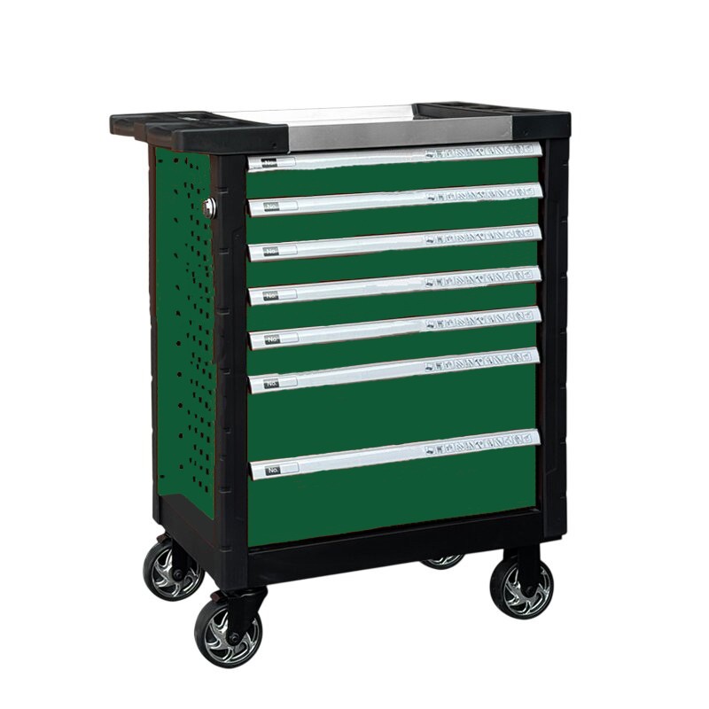 7 fiókos görgős, fékezhető szerszámkocsi. Nagy tárolókapacitás, kifejezetten professzionális felhasználásra, szerszámok, kis alkatrészek számára. Megerősített sarokvédők. Automatikus kihúzás elleni fiókreteszelés a véletlen kihúzás elleni védelemért.