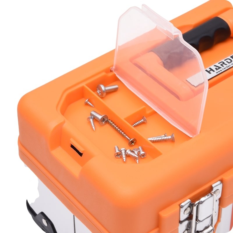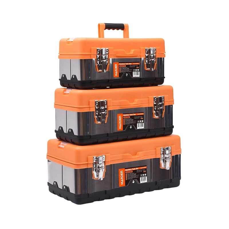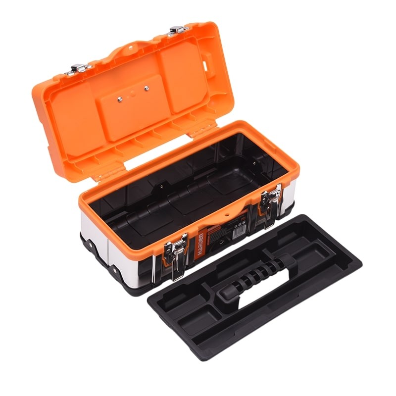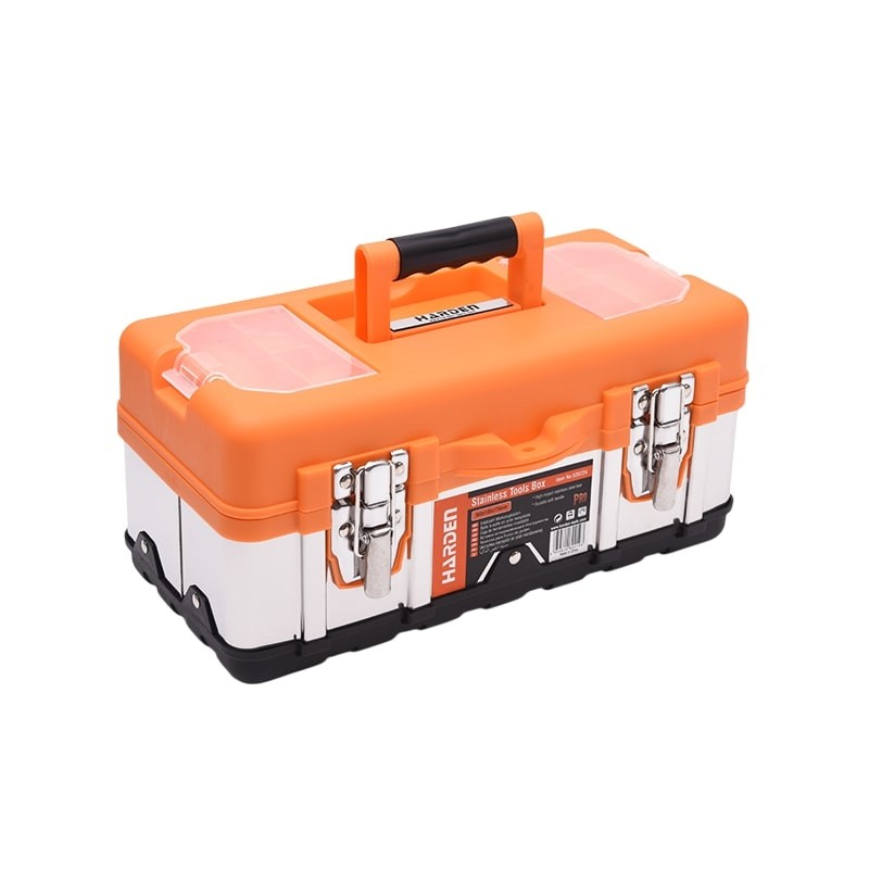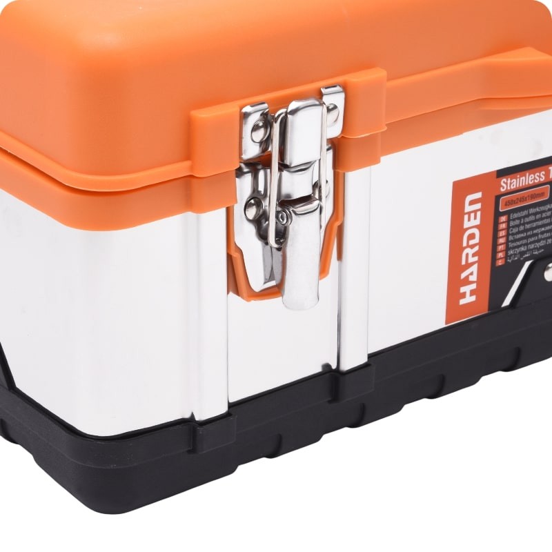 Rozsdamentes acél szerszámosláda fémcsatokkal. A szortimenter kialakítása lehetővé teszi kisebb elemek tárolását.
